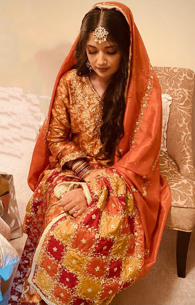 Our client chose our fabulous Daisy chattapatti dupatta for her Mehndi ceremony. She paired it with a banarsi kalidaar jora with light dabka work on the shirt, and a chooridaar pajama.
