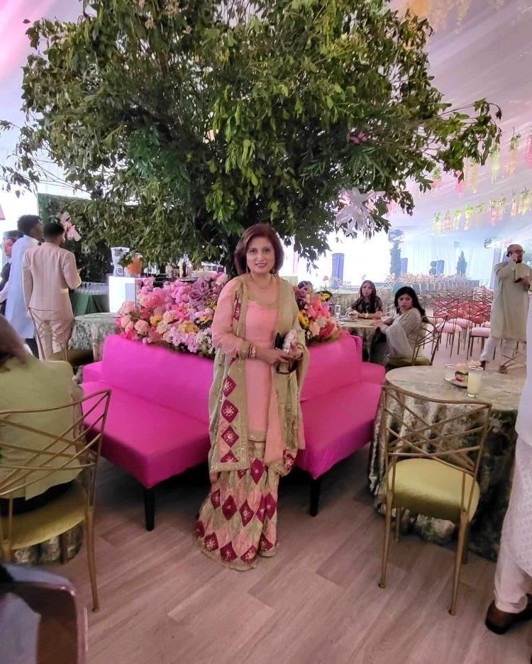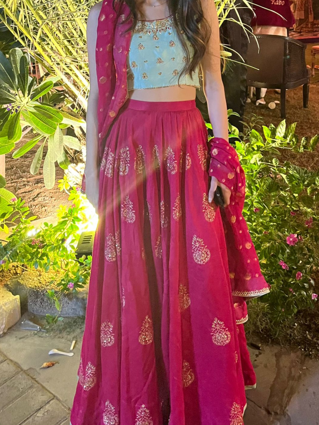 Our young client chose to wear the Magenta Block-Print Lehenga to her friend's dholki in Karachi, standing out beautifully with a dupatta and a contrasting mint choli, adorned with intricate resham and dabka work.