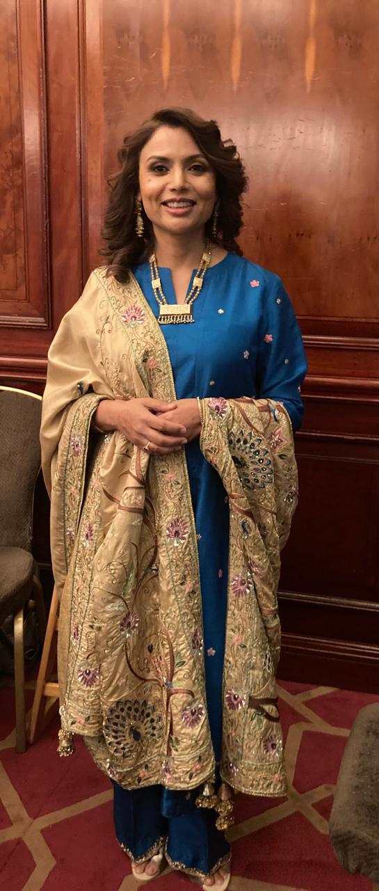 Our graceful client chose our Miniature Art Doshala to pair with her deep blue solid outfit, and doesn't it look lovely!