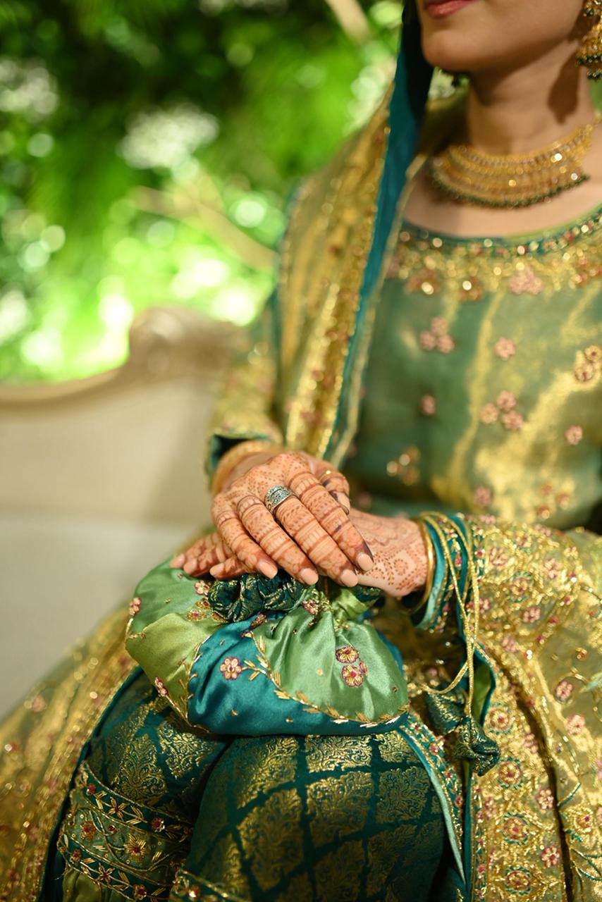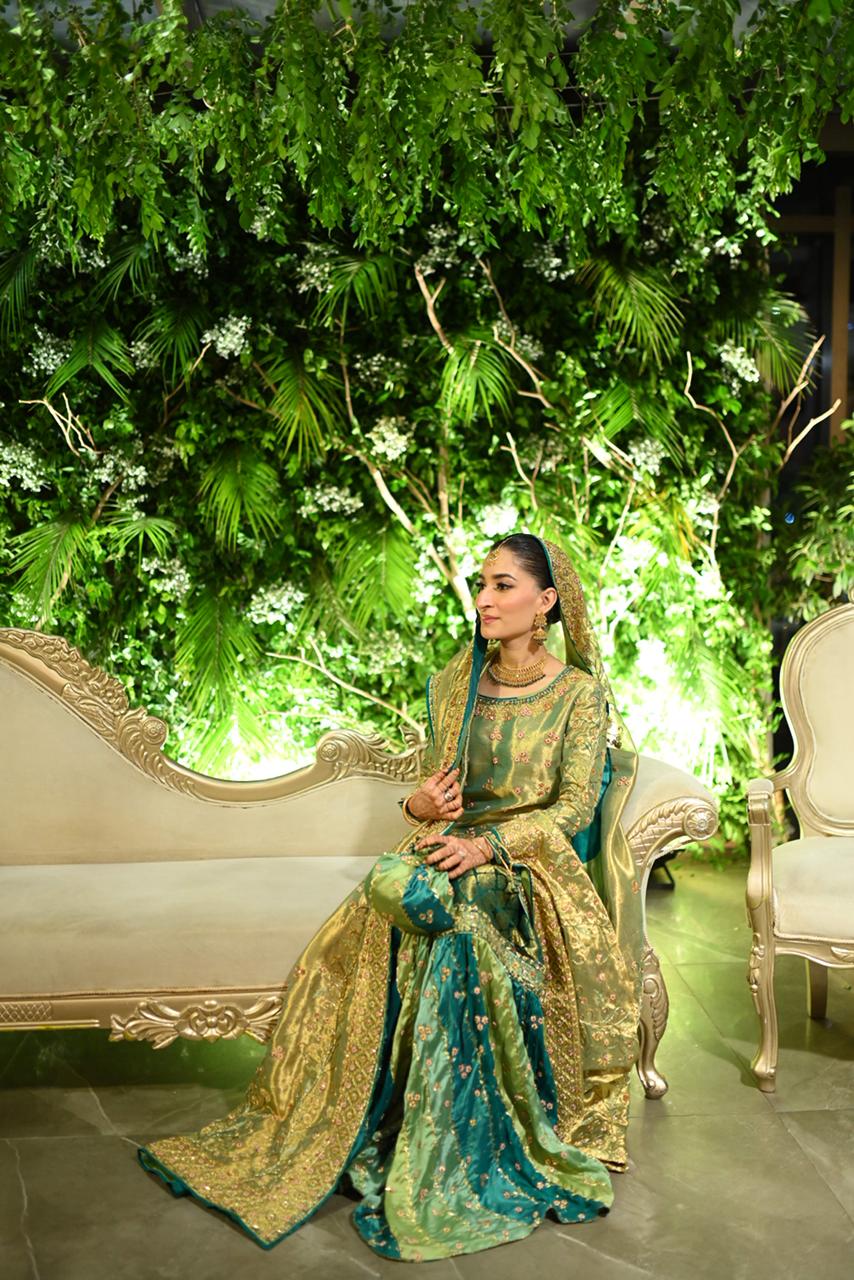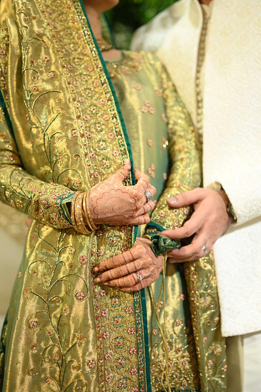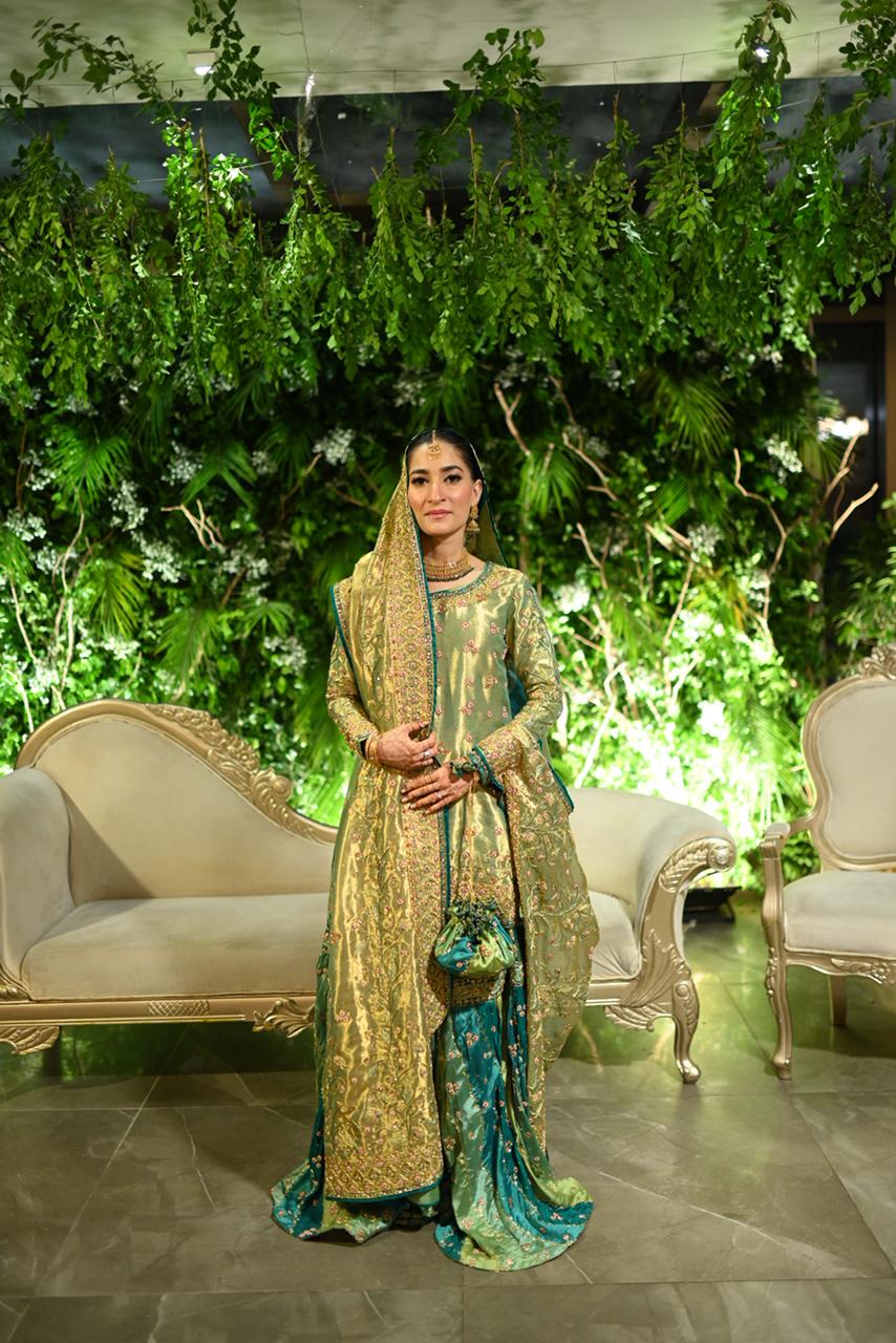 Shimmering shades of sea green, apple and lime ripple into each other in this beautifully handcrafted chatapatti. Paired with a two tone pure tissue shirt and dupatta, this gharara is an art piece. The elaborately designed zardozi work is ornate and spectacular creating an heirloom piece.