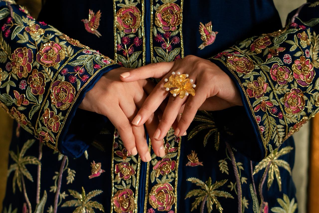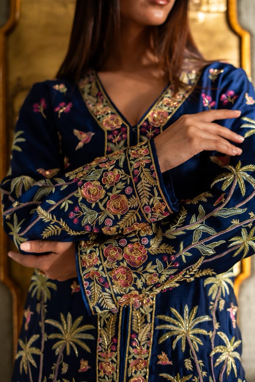 This short jacket  with a beautiful garden-inspired embroidery in resham, gold dabka and sequins features a thick floral border, birds and trees on a blue raw silk background. It is paired with a flowing pant.