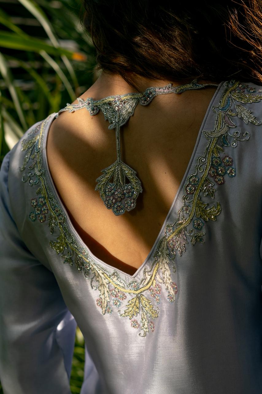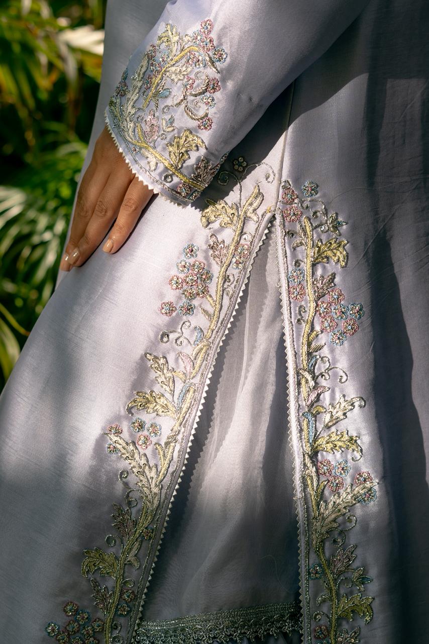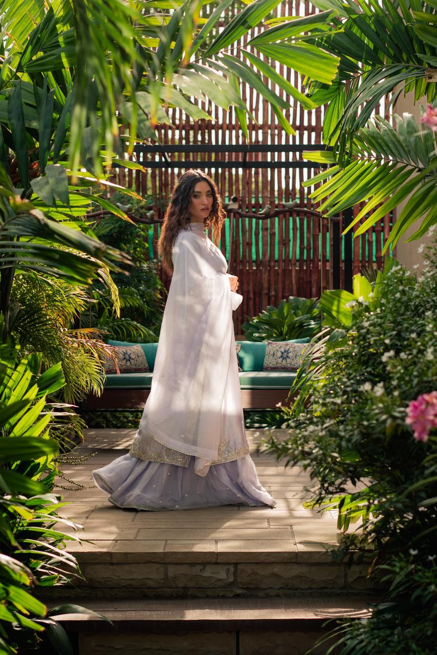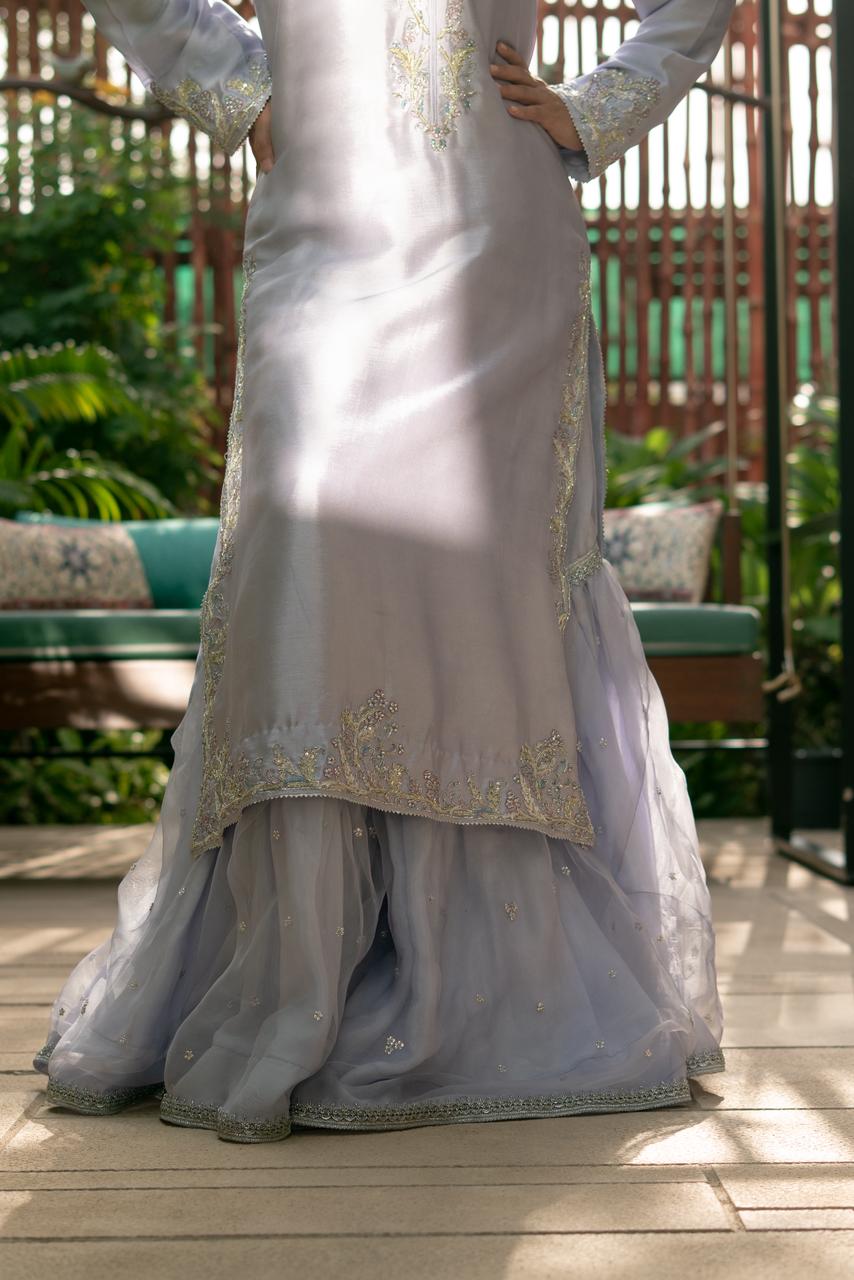 Delicate organza worked gharara in Lilac and silver has been coupled with a long raw silk shirt enhanced with silver dabka, sequins, crystal and resham embroidery.