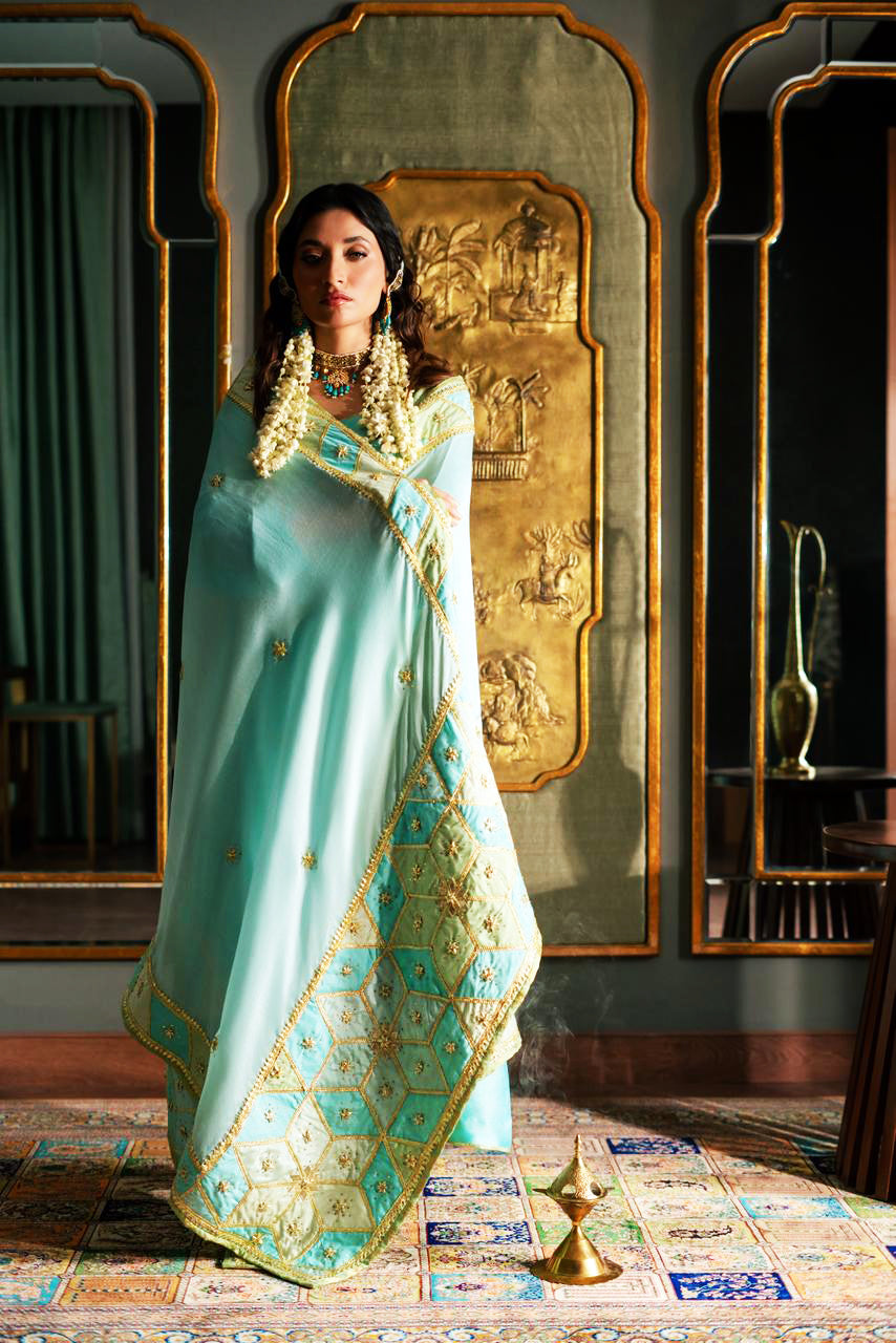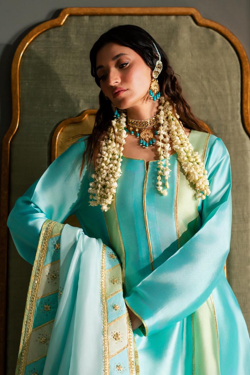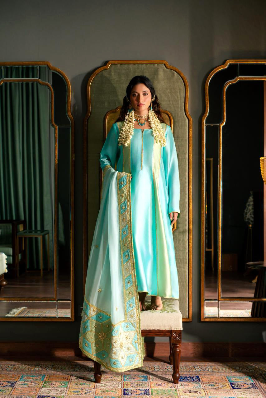 Shades of pale green, mint and teal are interspersed to make a beautiful chattapatti border on this silk chaddar. It has been enhanced by gold and paired with a multicoloured kurta to match.